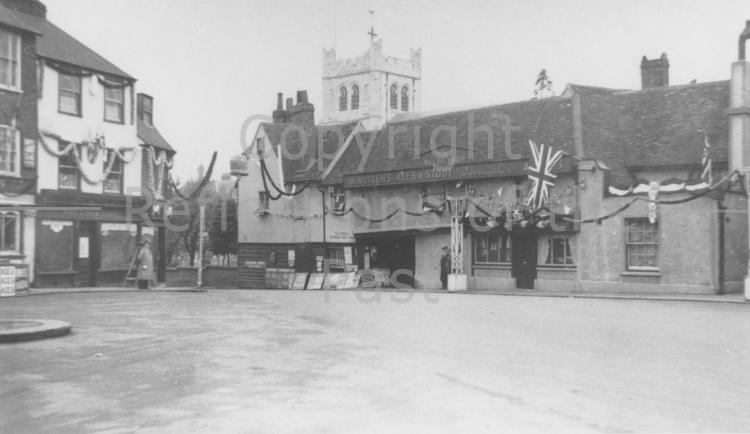 Market Square decorated for the Silver Jubilee of George 5th in 1935. The Welsh Harp Public House can be seen in the centre of this picture before the beams were exposed. Hall's Newsagents can be seen on the left of the pub.