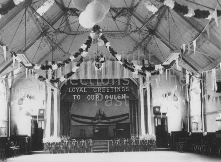 Inside the Town Hall looking towards the stage. Decorated for the Coronation of Elizabeth 2nd.