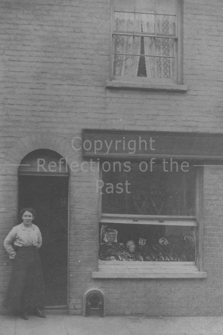 Mrs Florence Wood's Fish Shop at 29 Sun Street, in 1910. Florence married Fred Chaplin and later moved to 43 Sun Street, selling Fish and Chips as well as wet fish. Traded as Chaplins.