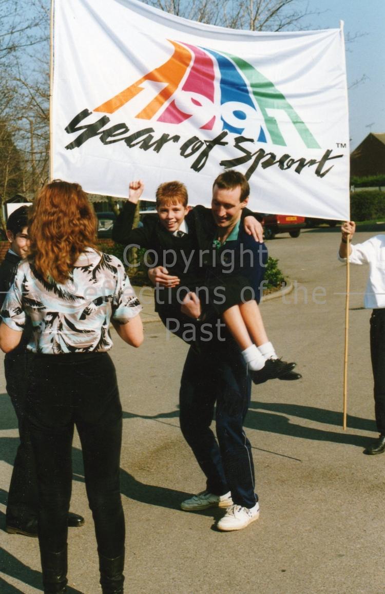 Natalie and Mr Clegue Head of PE pose for the newspapers at the launch of the 1991 Heritage Week Football Tournament. Photograph taken in the school's front car park.