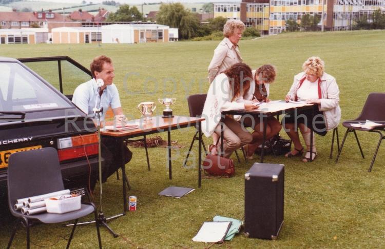 Mr Swan (on the PA sytem) with Mrs Gates, Mrs Willey, and Mrs Lowe writing winner's certificates on sports day. Date and any further details needed.
