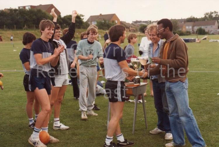 George Lee presenting trophy (involved with the PTA I believe) Andrew Hawkins in glasses. Mr Black (maybe) behind George.