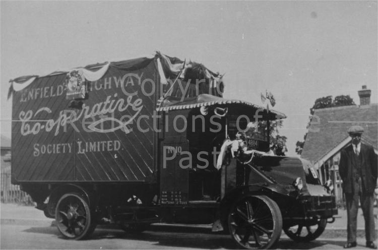 Enfield Highway Co-operative Society decorated solid tyred lorry pictured at Waltham Cross during the 50th Anniversary in 1922.