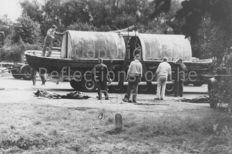 A powder boat, lifted from a North site canal, on it's trailer, ready to be transported for display on the South site. This picture sometime in the 1960s?