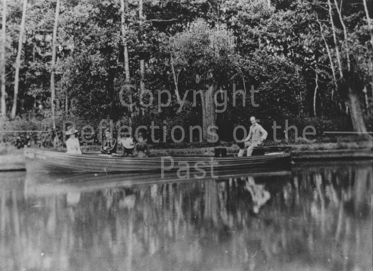 An electric powered boat used on the canals in the Royal Gunpowder Factory. It was plugged in to a re-charging point at the landing stage. This picture c1920.