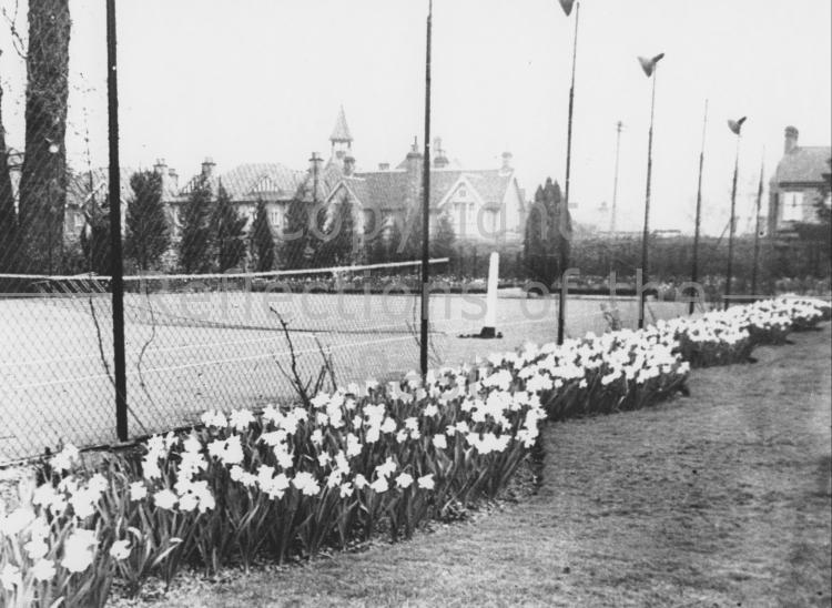 View from the rear of Joyce House, looking north west over the tennis court to Farm Hill Road. This picture c1930.