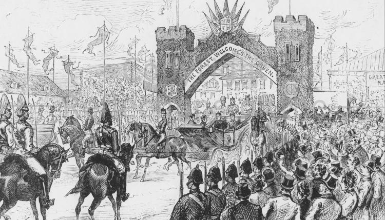 Queen Victoria leaving Chingford Station on her way to High Beech to dedicate Epping Forest for the use and enjoyment of her people for all time. 6th May 1882. (Illustration)